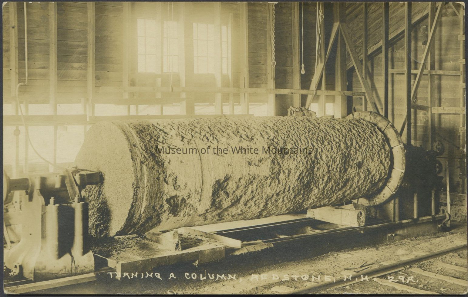 Sepia toned image of a large piece of raw wood or other material on a machine in a work room. Caption reads, “Turning a column, Redstone N.H.”
