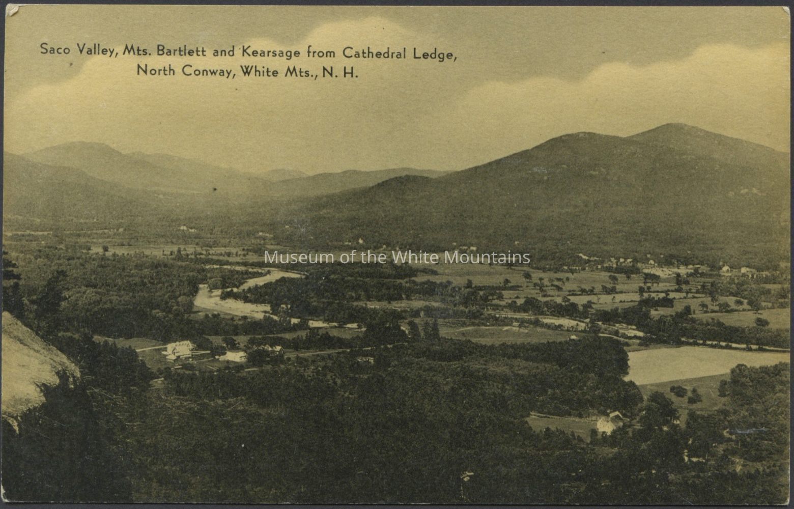 Sepia toned image of clearings, buildings, farmland with mountains in the background. Caption reads, “Saco Valley, Mts. Bartlett and Kearsarge from Cathedral Ledge, North Conway, White Mts., N.H.”