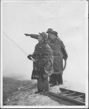 Image is a black and white view of a three firemen. One fireman holds a hose spraying water, another points off towards the left, and the other looks on. There is a ladder lying on the ground next to them. There appears to be snow on the ground.