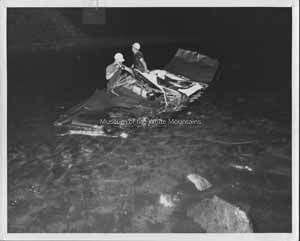 Image is a black and white view of two rescue workers in a river surveying a wrecked car. One man holds a flashlight and is shining it into the car.
