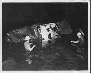 Image is a black and white view of two rescue workers in a river surveying a wrecked car. They appear to be making their way towards the car. The man on the left is wearing a light colored shirt and the man on the right has a raised right hand. Back Description: Written on the back in blue pen is: "North Conway Fire Dept"
