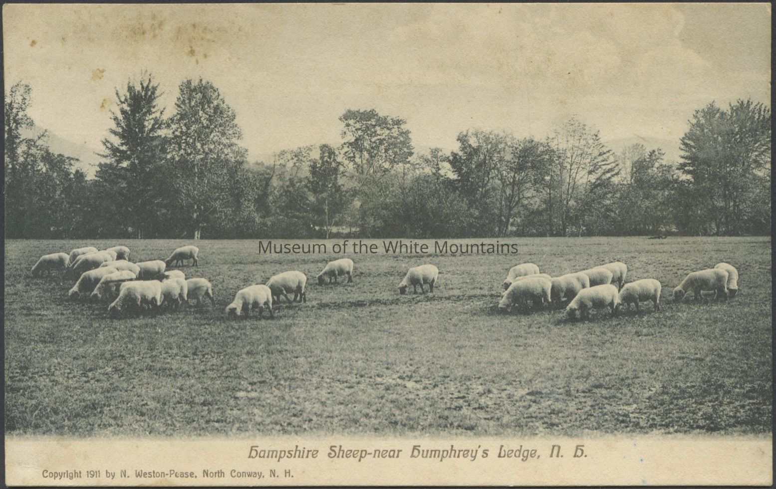 Sepia toned image of several sheep grazing in a field lined with trees and mountains in the background. Caption reads, “Hampshire Sheep- near Humphrey's Ledge, N.H.” Back Description: Typical postcard back.