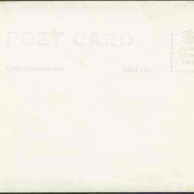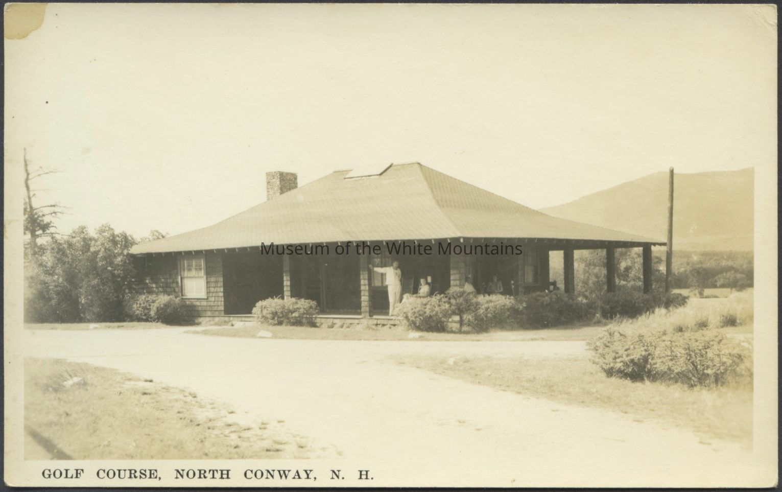 Sepia toned a building with a low-pitched roof and people under its eaves. In the background are mountains. Caption reads, “Golf Course, North Conway, N.H.”
