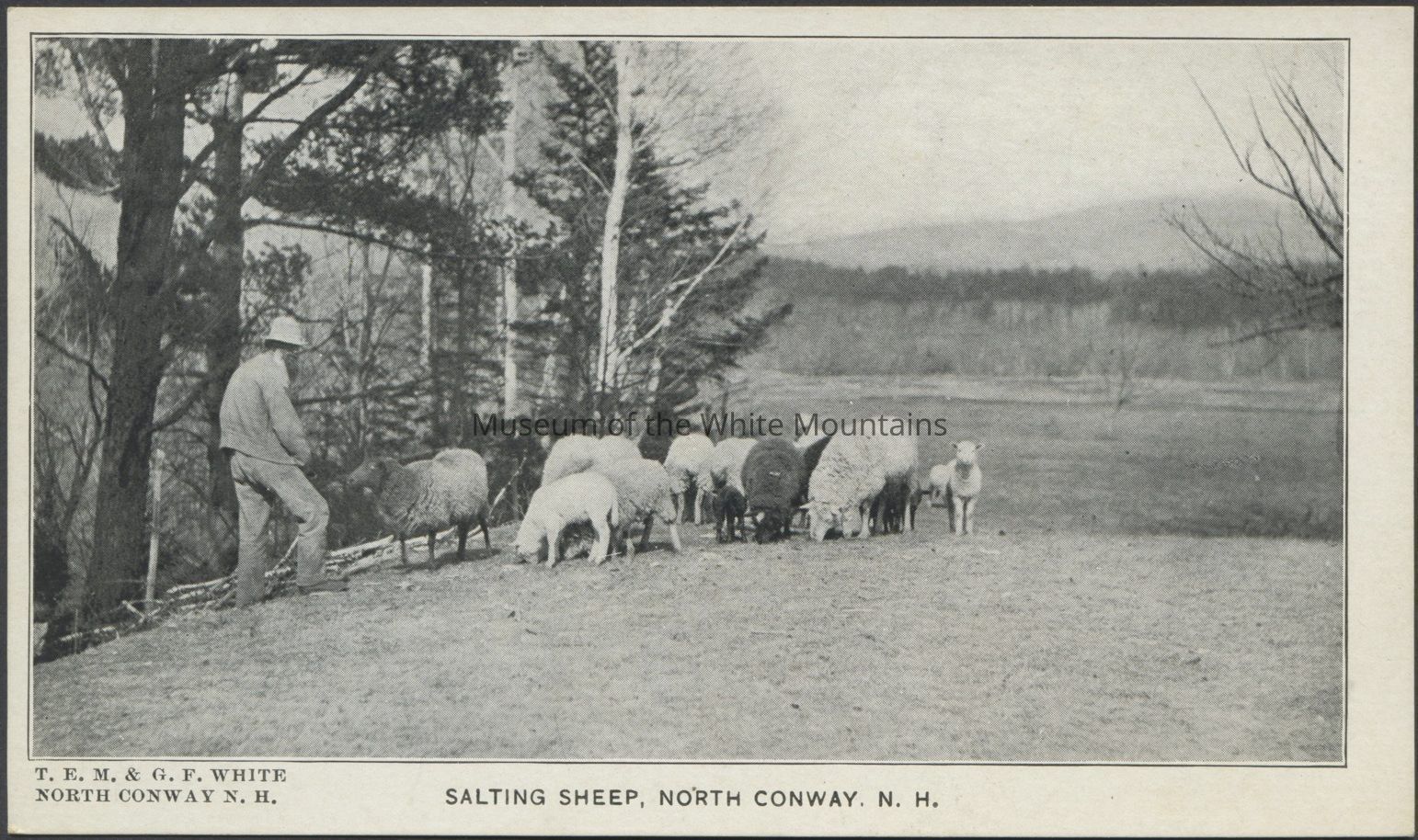 Black and white image of sheep in a field with mountains in the background. A man stands with the sheep. Caption reads, “Salting sheep, North Conway, N.H.”