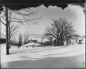 Black and white view of a winter landscape. Snow is piled up almost to the top of a wooden fence. In the background are large houses with roofs covered in snow. The trees are bare and it appears to be a sunny day. Unidentified location: somewhere in the White Mountains.