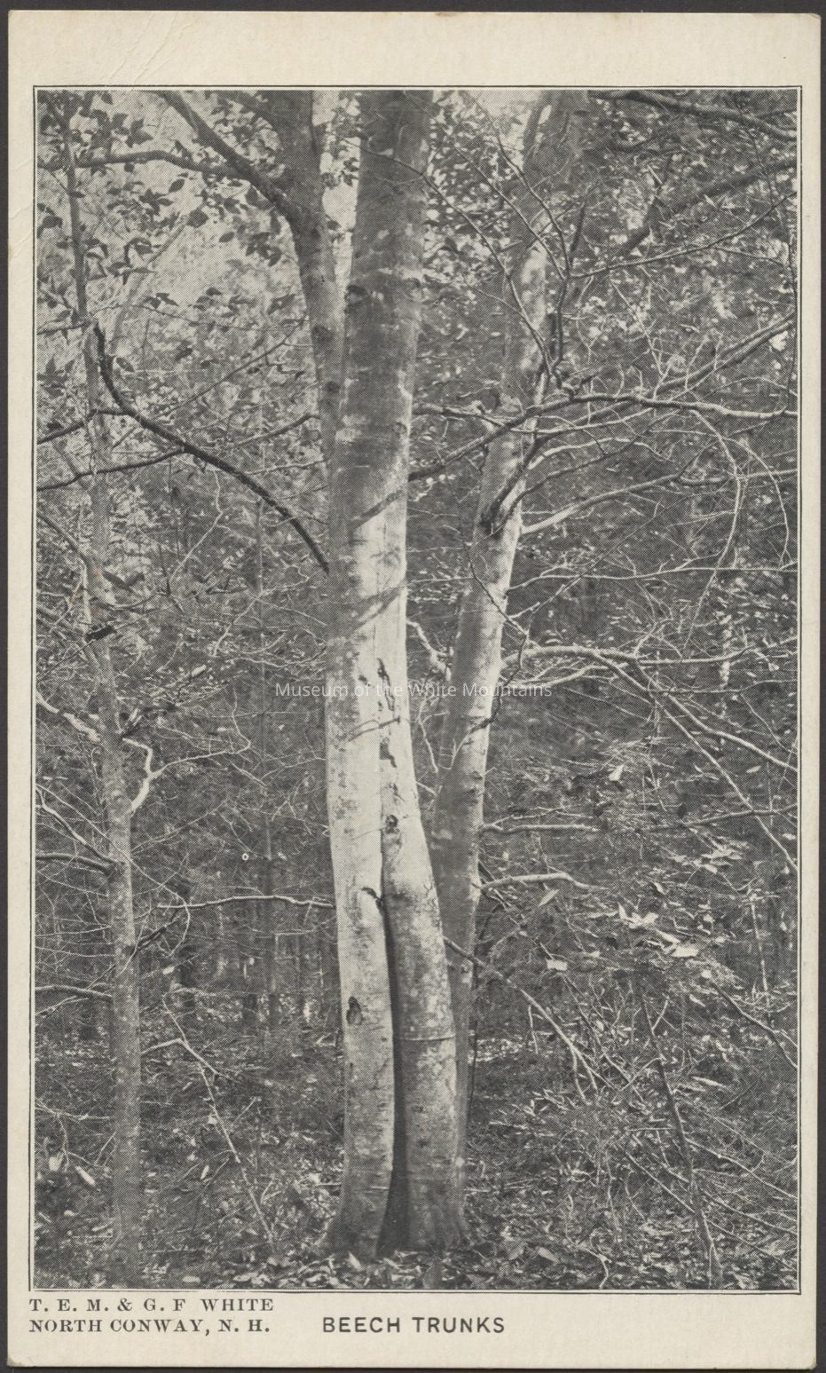 Black and white image a wooded area. Caption reads, “Beech trunks.” Back Description: Typical postcard back.