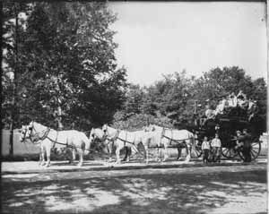 Suits (Clothing), Boys, Horse teams, Men, Trees, Dresses, Coaches, People, Women, People associated with transportation, Dirt roads, Men & women, Horses, Paths, Poles, Utility
