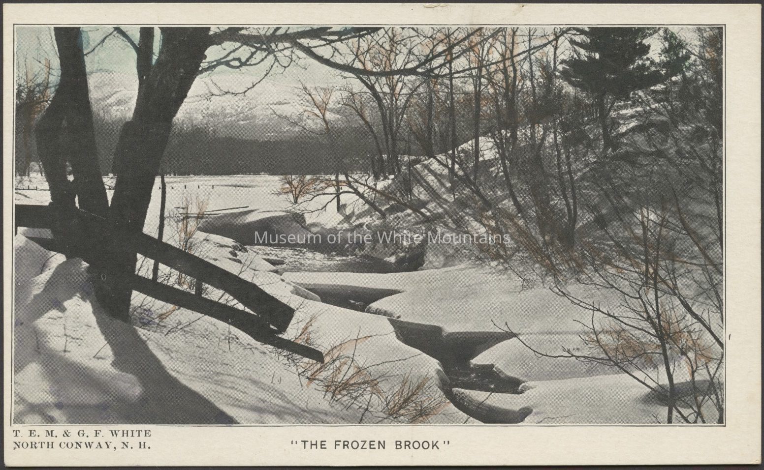 Black and white image of a brook frozen with snow. In the background are mountains. Caption reads, “The frozen brook.”