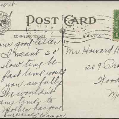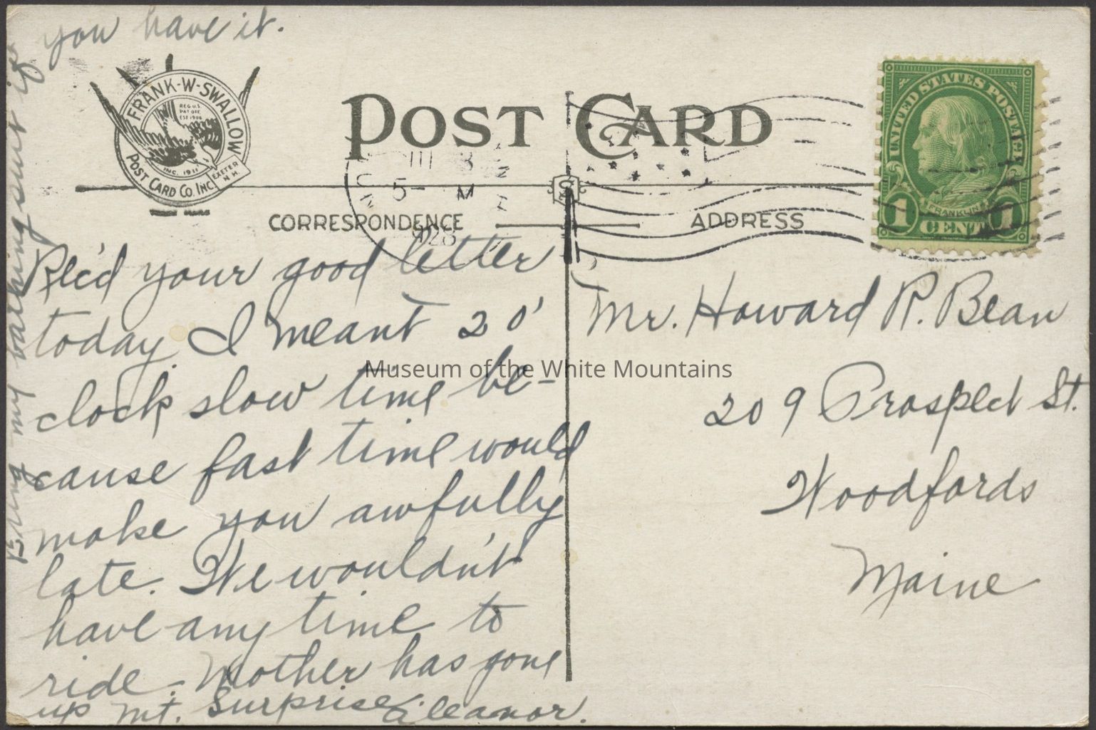 Transcription: "Rec'd your good letter today. I ment 2 o'clock slow time because fast time would make you awfully late. We wouldn't have any time to ride. Mother has gone up Mt. Surprise. Alenor Bring my bathing suit if you have it."