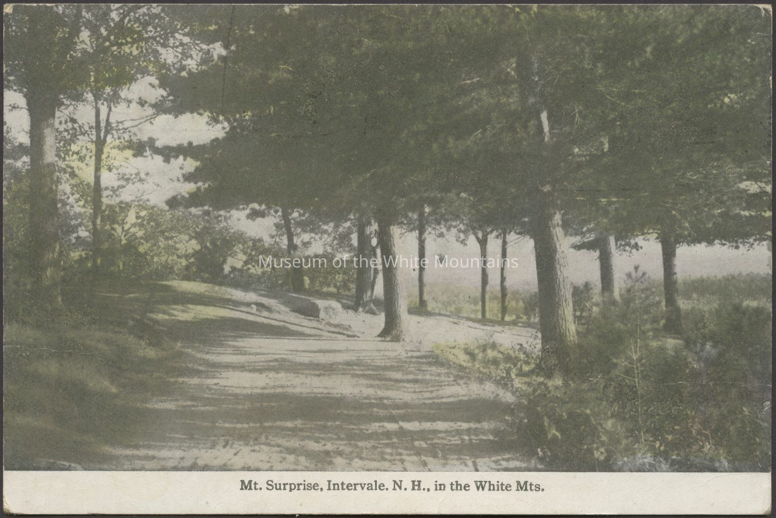 Black and white image of a wooded area with a trail. Caption reads, “Mt. Surprise, Intervale, N.H. In the White Mts.”