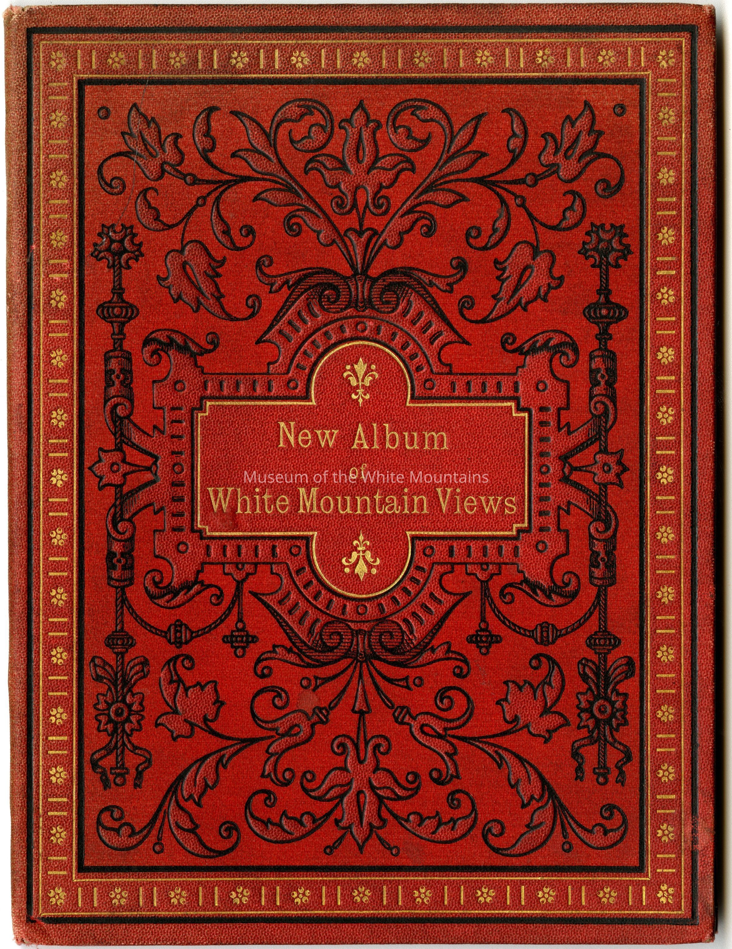 A hard cover red book containing artistic depictions of places / scenes from the White Mountains.