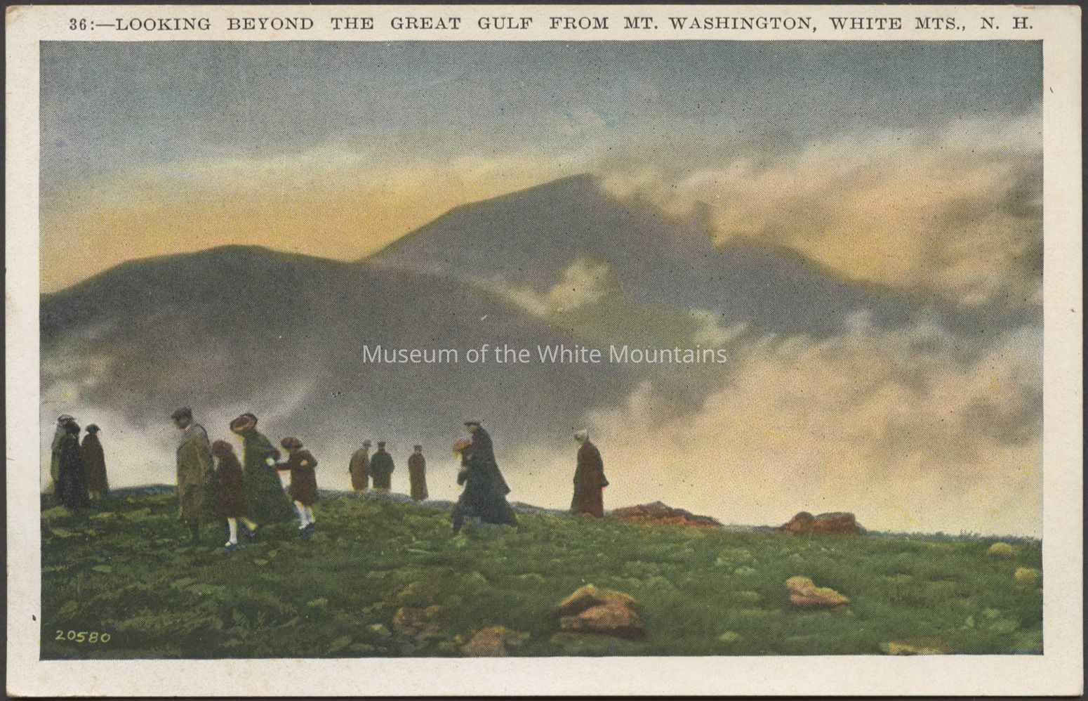 Colored image of people walking across a rocky field with clouds and mountains in the background. Caption reads, “Looking beyond the great gulf from Mt Washington, White Mts., N.H.”