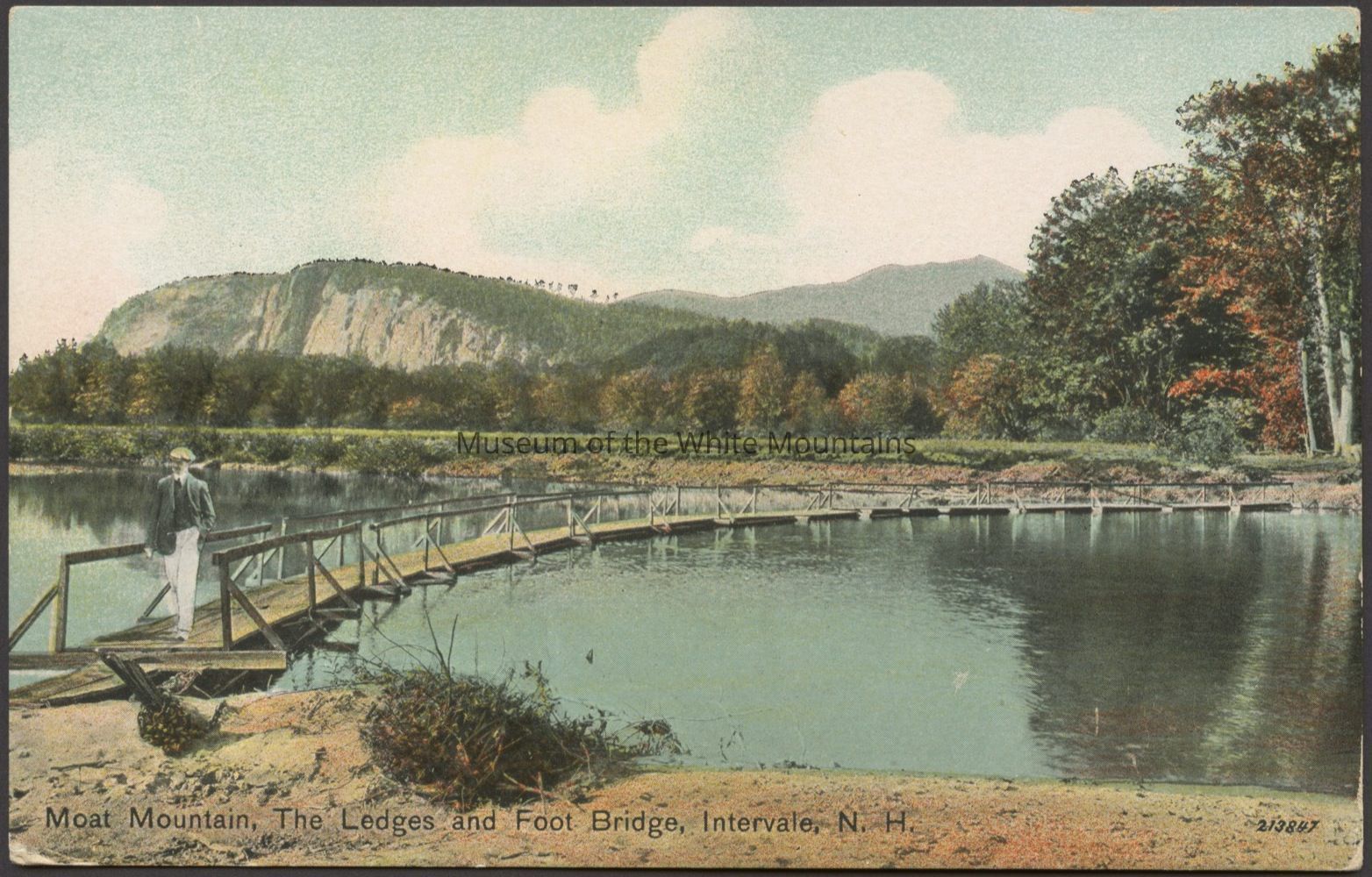 Colored image of a lake with a footbridge running across and a man walking on it. Mountains are in the background. Caption reads, “Moat Mountain, The Ledges and Foot Bridge, Intervale N.H.”