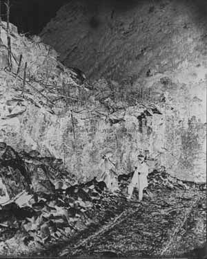 Image is a black and white inversion of two men standing on a rocky dirt path dusted with snow. They appear to be standing next to a logging trail.
