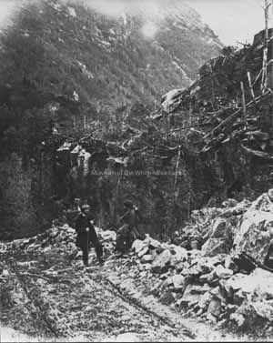 Black and white view of two men standing on a rocky dirt path. They appear to be standing next to a logging trail. On either side of the trail is slash. The men are carrying packs. Unknown location: somewhere in the White Mountains.