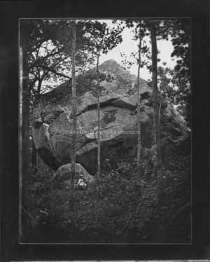 Black and white view of a man and woman. The woman sits in front of a large rock and the man stands with a walking stick. There is a large boulder behind them. Thin trees pepper the foreground.