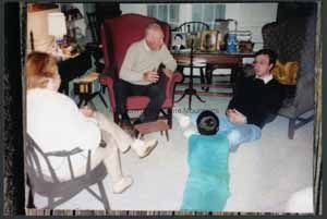 Four people in a room (living room?) talking. Three adults, one child. The people are sitting in a circle. There is a table behind the people with books and photos on it. Other chairs and typical household items can be seen in the photo.Collection