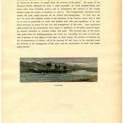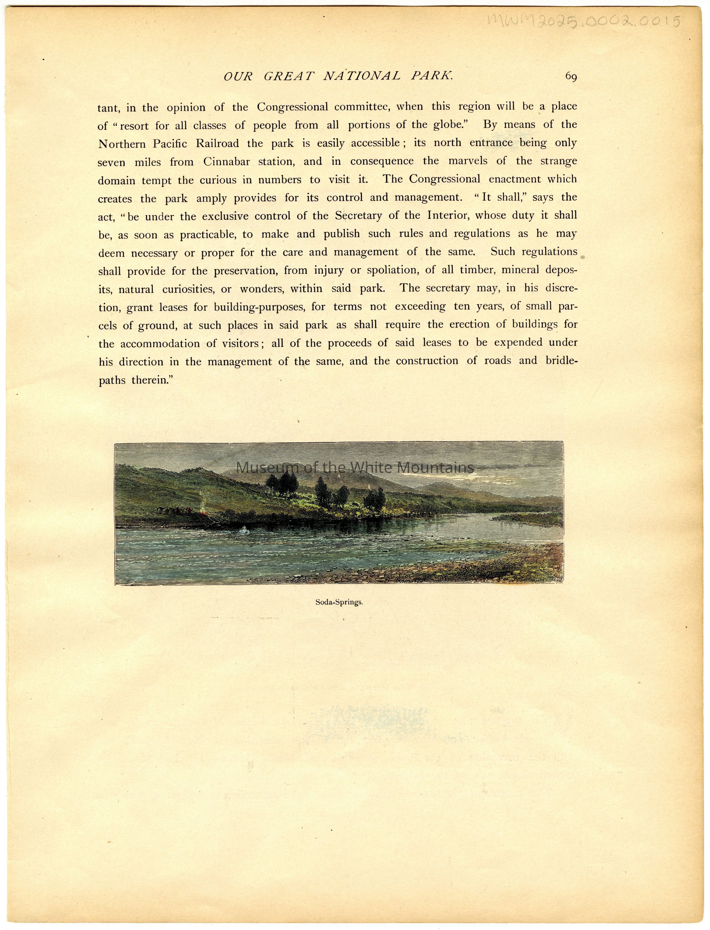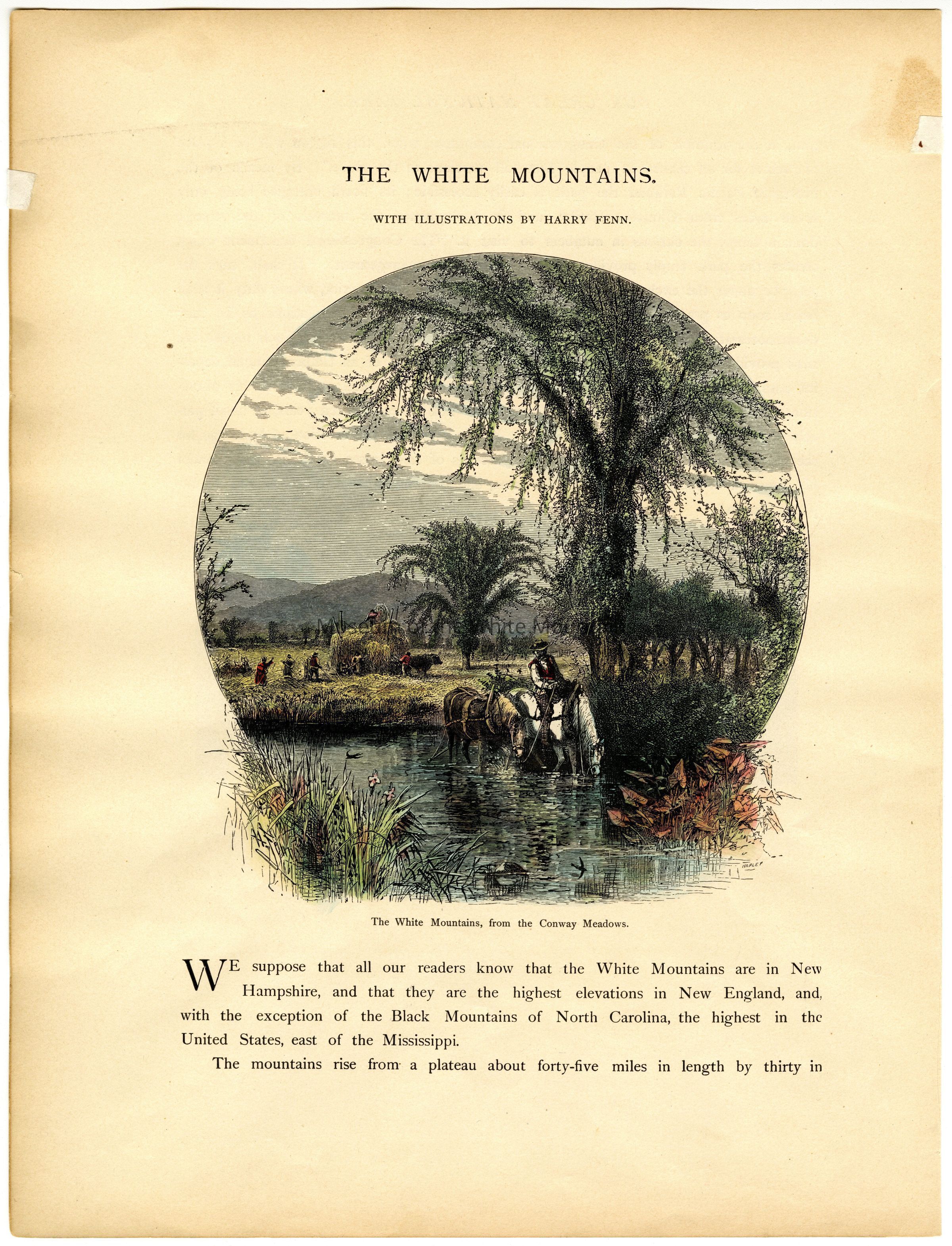 A page of a publication with an illustration of the White Mountains viewed from the Conway Meadows.Type of Print