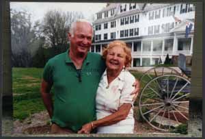 Two people standing together in front of a building (possibly an inn or hotel?). There is some kind of carrige behind them also. One male, one female. The people are Bob and Dot Goldberg.Collection