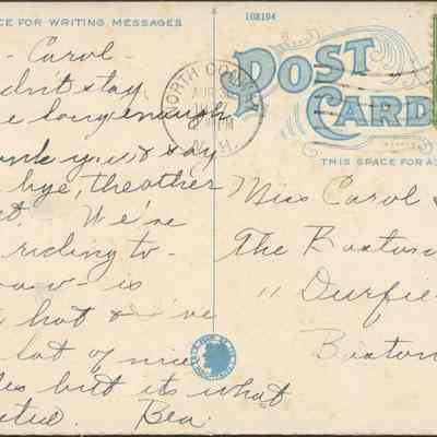 Transcription: "Hello Carol- I didn't stay awake long enough to thank you and say good bye the other night. We're going… tomorrow. It is quite hot+ I've got a lot of nice freckles but… is what… Bea"