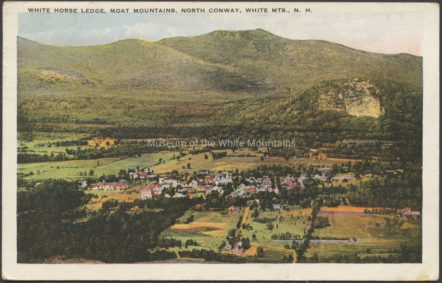 Colored image of a town with mountains in the background. Caption reads, “White Horse Ledge, Moat Mountains, North Conway, White Mts., N.H.”