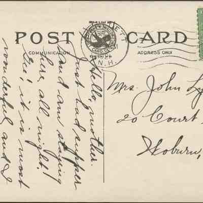Back Description: Typical postcard back. Features a handwritten note, postmark, and postage stamp.