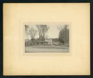 This is an image of a large farmhouse and barn in black and white. There is a dog visible in front of the house and some horses behind the house. There are trees in in the foreground and background and a shed in the back left.