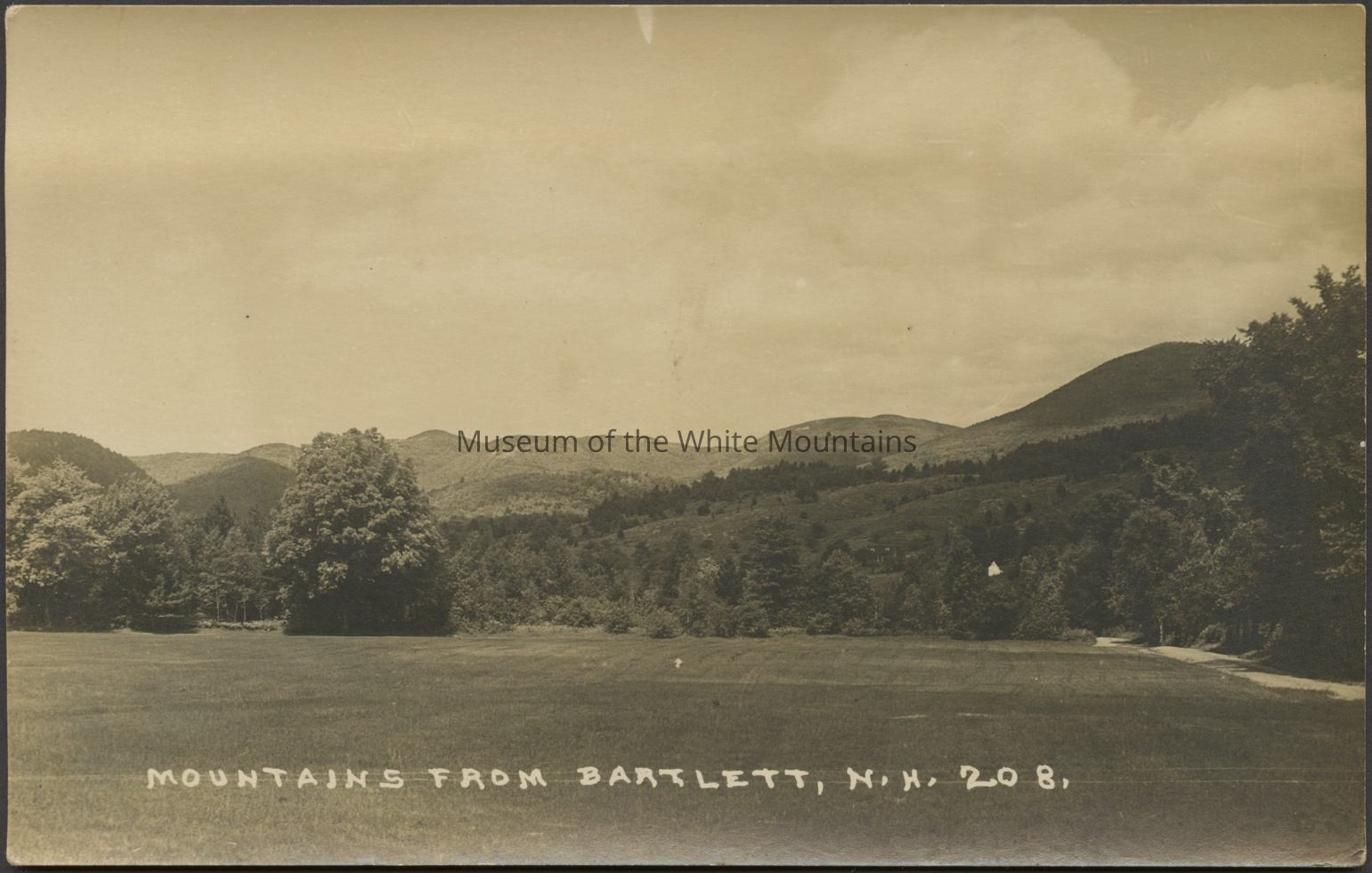 Sepia toned image of a clearing with mountains and trees in the background. Caption reads, “Mountains from Bartlett, N.H.”
