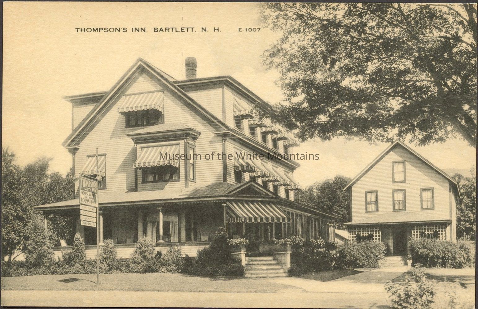 Sepia toned image of two buildings. One has several windows with awnings and a large porch. The other is smaller with lattice on its porch. Caption reads, “Thompson's Inn, Bartlett NH.” Back Description: Typical postcard back.