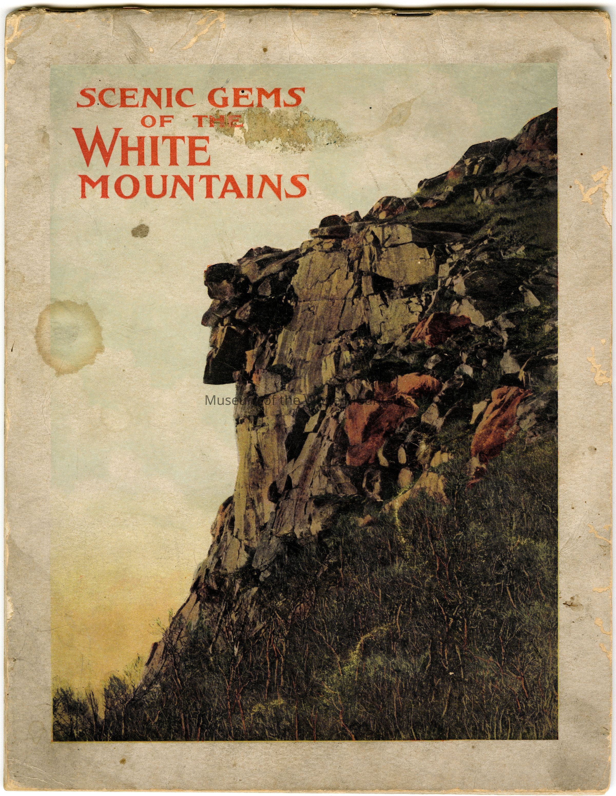 A booklet with a cover containing a color photograph of the Old Man of the Mountain surrounded by a grey border and a series of black and white photographs of the White Mountains inside.