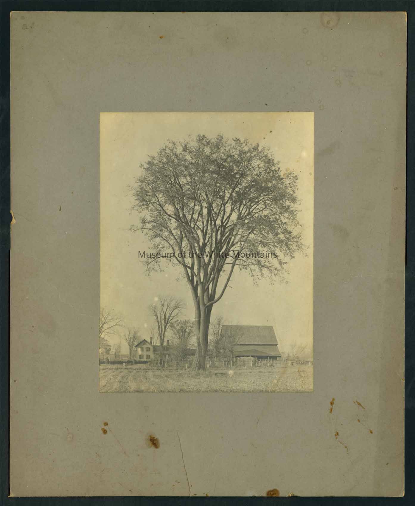 Black and white photograph of a large tree in front of a rural farm. Behind the tree are several fences surrounding the land and barn. The barn is on the right side of the photograph. On the left side towards the back is the farmhouse. Farther in the background is another house.