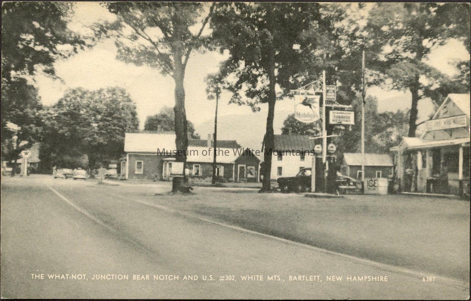 Black and white image of a street lined with buildings, one being a gas station. Caption reads, “The What-not, Junction Bear Notch and U.S. #302, White Mts., Bartlett, NH.”