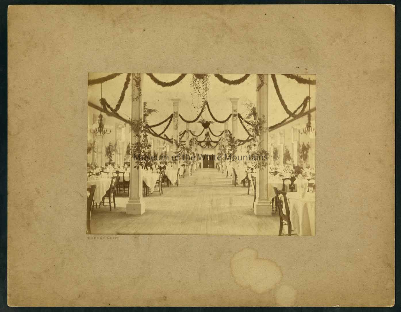 Black and white photograph of a reception hall filled with chairs and tables which are covered with a white linen. There is a walkway lined with columns in the middle of the hall. On each of the columns is a plant holder. Several more plants as well as chandeliers and garland hang from the ceiling.
