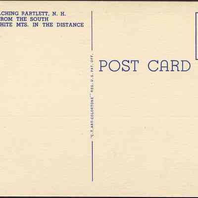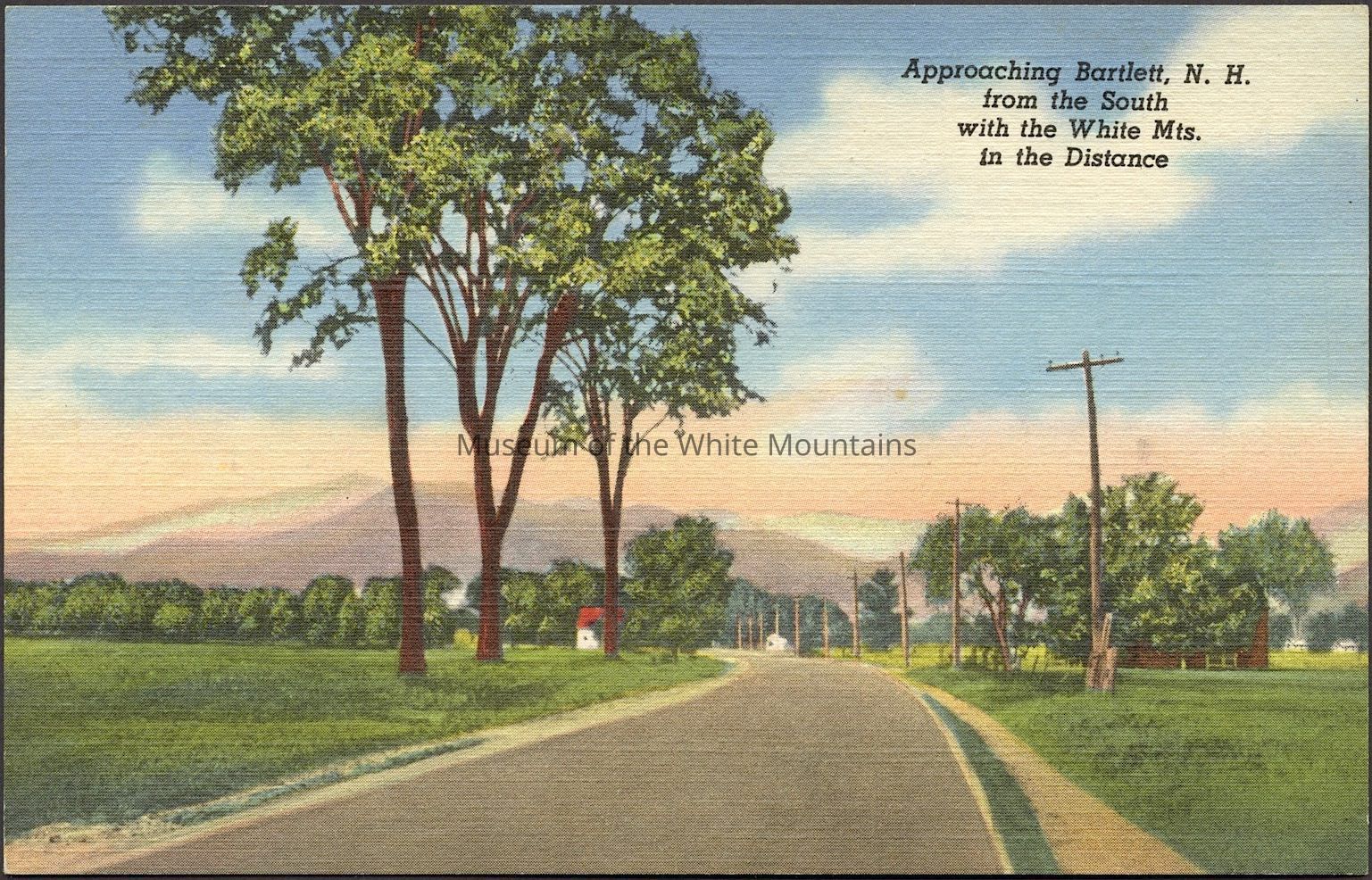Colored image of a road with buildings and mountains in the background. Caption reads, “Approaching Bartlett NH from the south with the White Mts. In the distance.”