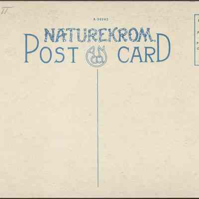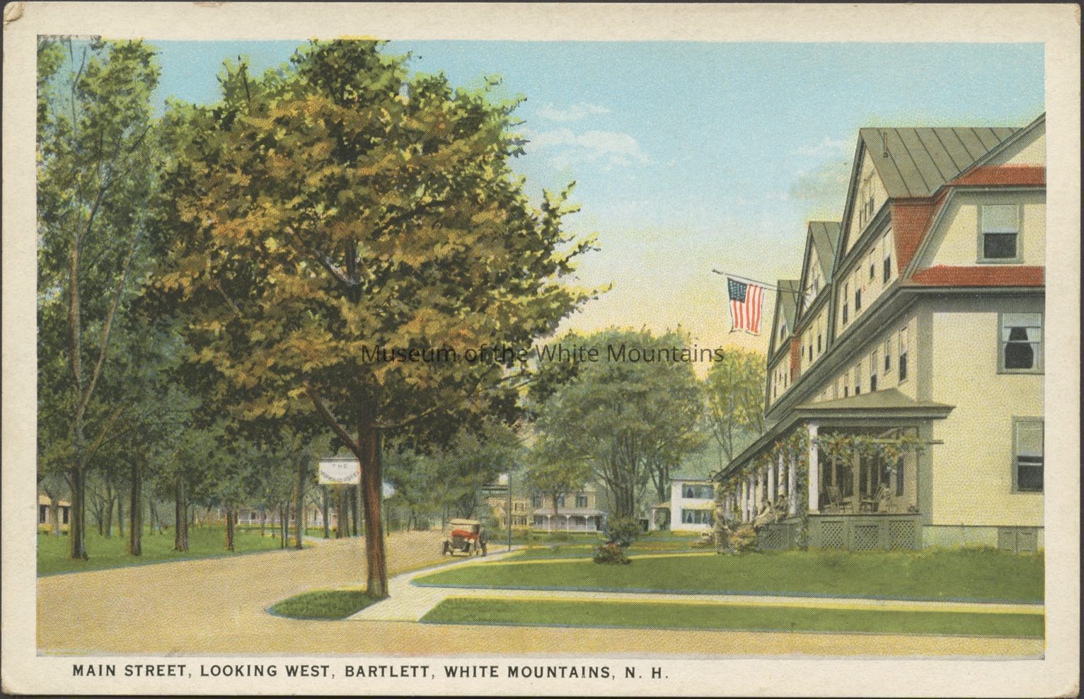 Colored image of a dirt road with an automobile parked by a large building. In the background are more buildings. Caption reads, “Main Street, looking west, Bartlett, White Mountains NH.”