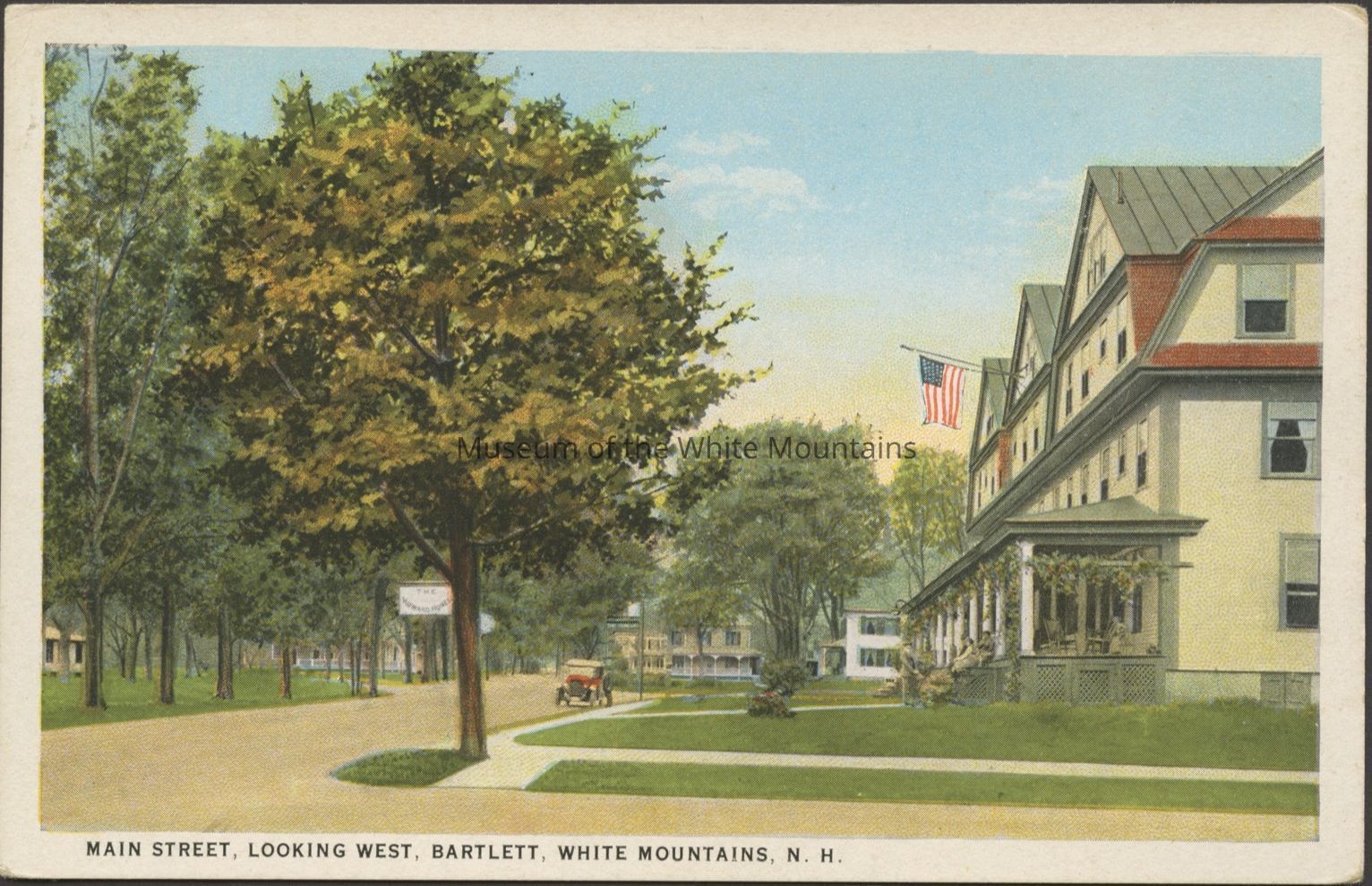 Colored image of a dirt road with an automobile parked by a large building. In the background are more buildings. Caption reads, “Main Street, looking west, Bartlett, White Mountains NH.”