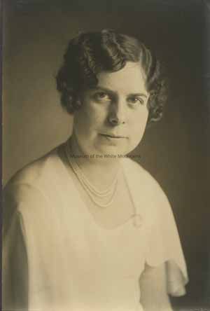 Black and white studio portrait of an unidentified woman. She is in a serious pose looking straight ahead. She is wearing a white dress and is wearing a pearl necklace. Black studio background. Written in pencil on back, "3".