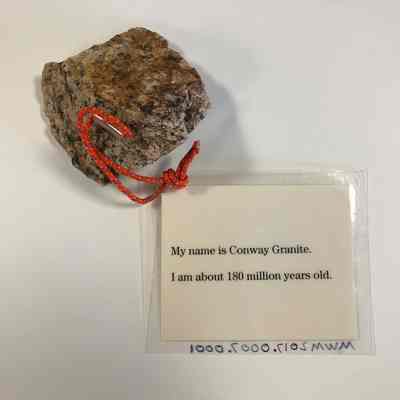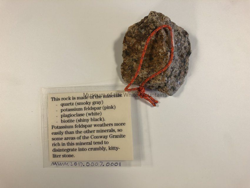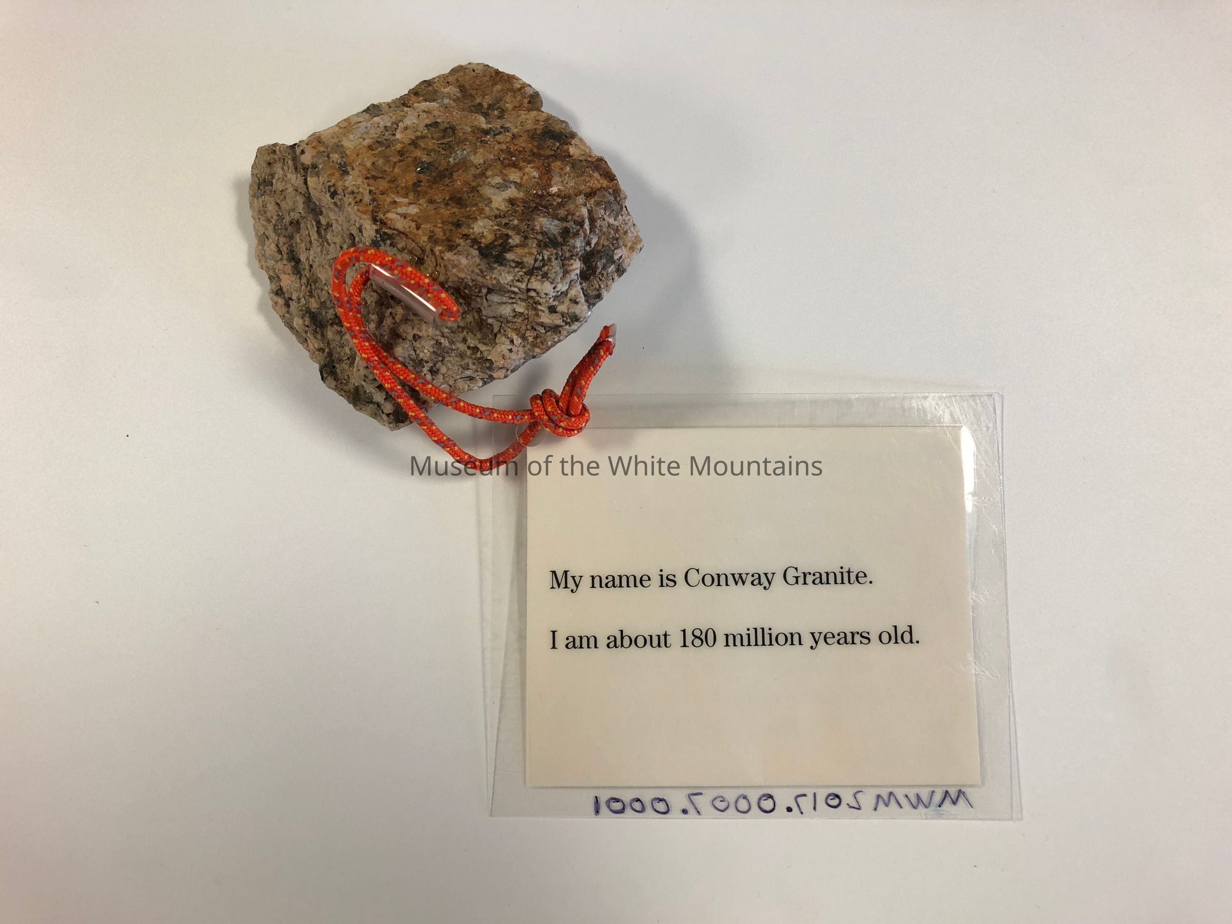 Small hand-sampled piece of Conway Granite. Conway Granite is made up of the following minerals: quartz (smoky gray), potassium feldspar (pink), plagioclase (white), and biotite (shiny black). Sample is about 180 million years old. Collected by two well-trained geology students for the 2014 "Beyond Granite" exhibition at MWM. Part of a complete (or at least comprehensive) hand-sample collection of all the rocks of the White Mountains.Collection