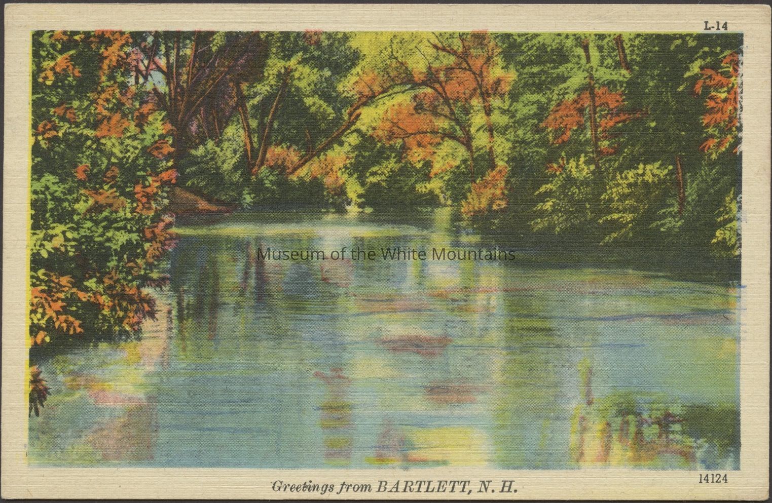 Colored image of a body of water surrounded by trees with colorful foliage. Caption reads, “Greetings from Bartlett NH.”