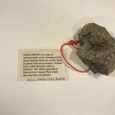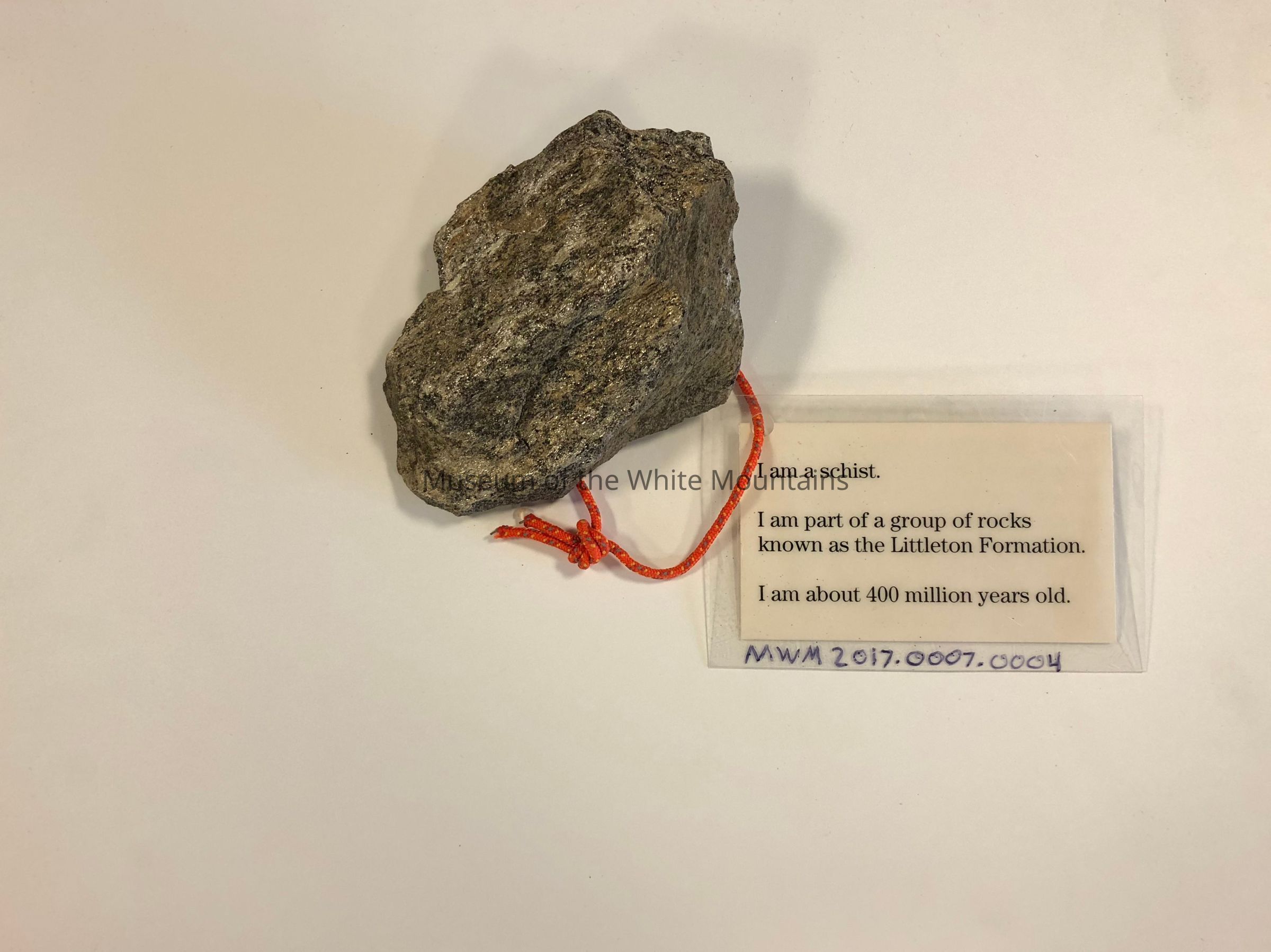 Small hand-sampled piece of schist rock. This sample is part of a group of rocks known as the Littleton Formation and is about 400 million years old. This rock has a foliation of both micas, and siny red garnets. Collected by two well-trained geology students for the 2014 "Beyond Granite" exhibition at MWM. Part of a complete (or at least comprehensive) hand-sample collection of all the rocks of the White Mountains.Acquisition
