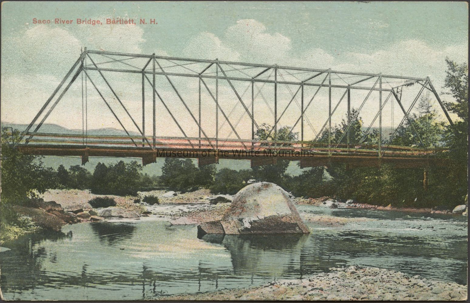 Colored image of a bridge over a rocky river. Caption reads, “Saco River Bridge, Bartlett NH.”