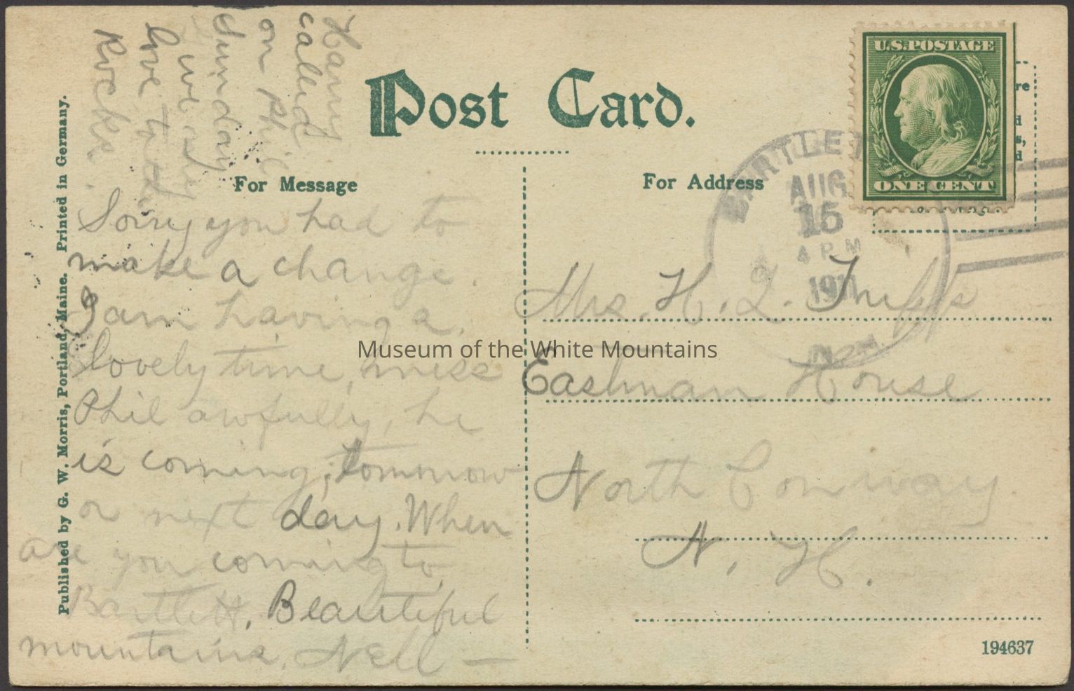 Transcription: "Sorry you had to make a change I am having a lovely time, miss Phil awfully, he is soming tomorrow or next day. When are you coming to Bartlett. Beautiful mountains are swell- Harry called on Phil Sunday with my love to the…"