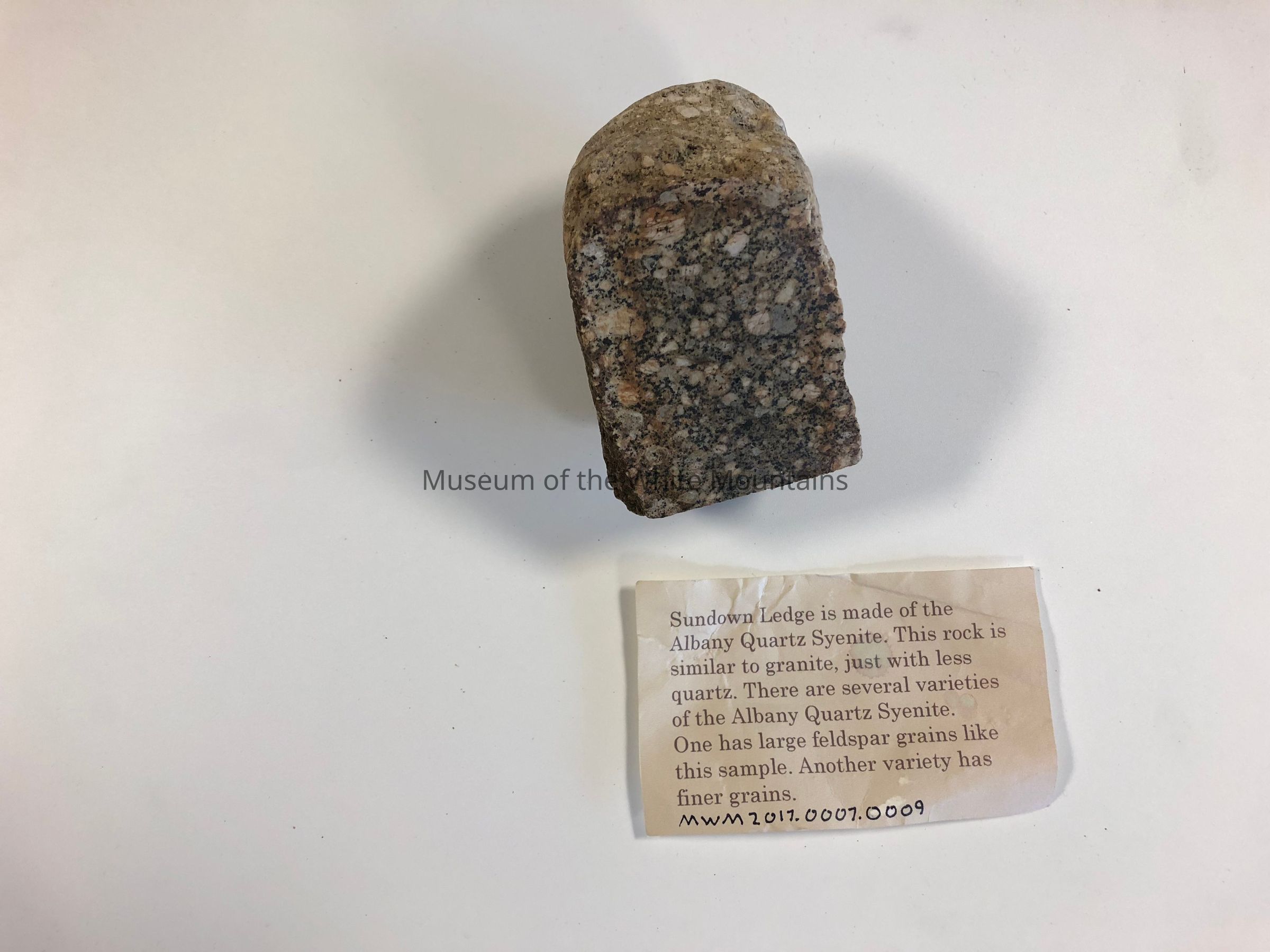 Small hand-sampled piece of Albany Quartz Syenite. This type of rock is found at, and makes up, Sundown Ledge. This sample is similar to granite only with less quartz. This varity of Albany Quartz Syenite has large feldspar grains while other varities have much finer grains. Collected by two well-trained geology students for the 2014 "Beyond Granite" exhibition at MWM. Part of a complete (or at least comprehensive) hand-sample collection of all the rocks of the White Mountains.Acquisition