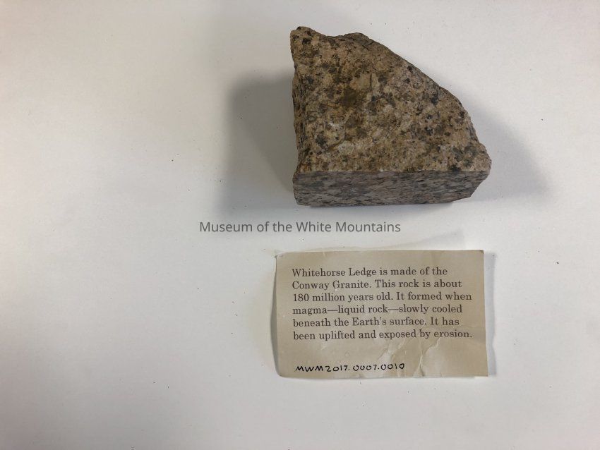 Small hand-sampled piece of Conway Granite. This type of granite is found at, and makes up, the Whitehorse Ledge. This sample is about 180 million years old. Collected by two well-trained geology students for the 2014 "Beyond Granite" exhibition at MWM. Part of a complete (or at least comprehensive) hand-sample collection of all the rocks of the White Mountains.Acquisition