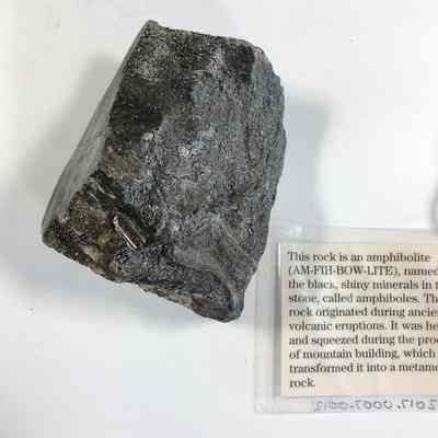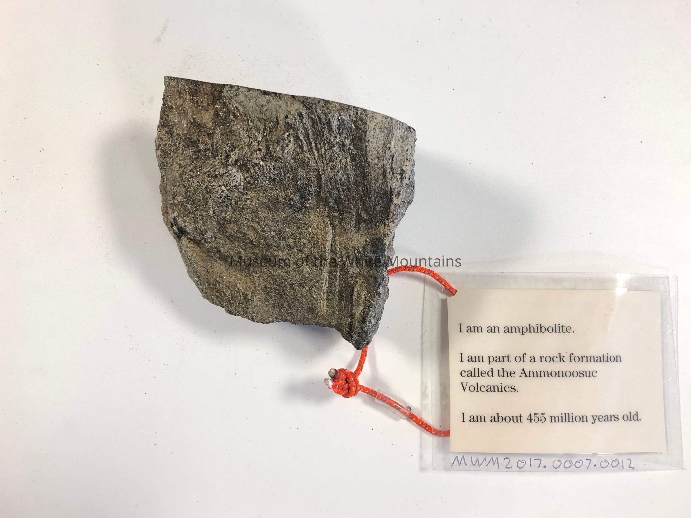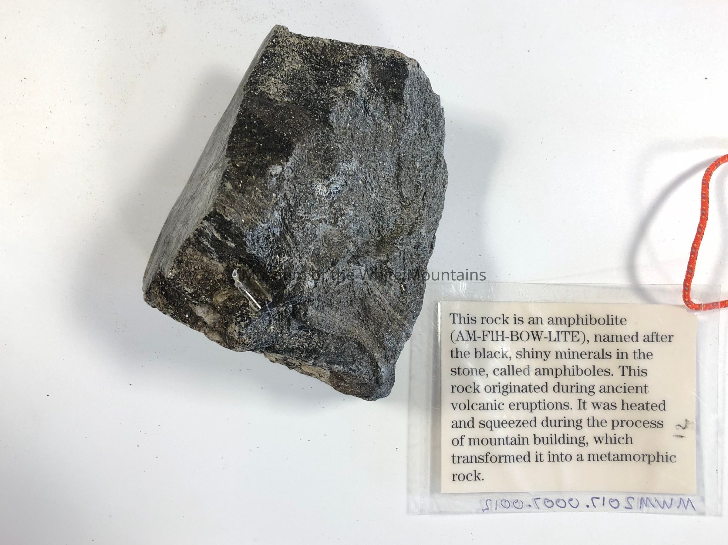 Small hand-sampled piece of amphibolite. This Sample contains, and is named for, the black shiny minerals in the rock called Amphiboles. This Amphibolite, which is a metamorphic rock, belongs to a rock formation called the Ammonoosuc Volcanics. This rock is about 455 million years old. Collected by two well-trained geology students for the 2014 "Beyond Granite" exhibition at MWM. Part of a complete (or at least comprehensive) hand-sample collection of all the rocks of the White Mountains.Acquisition