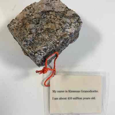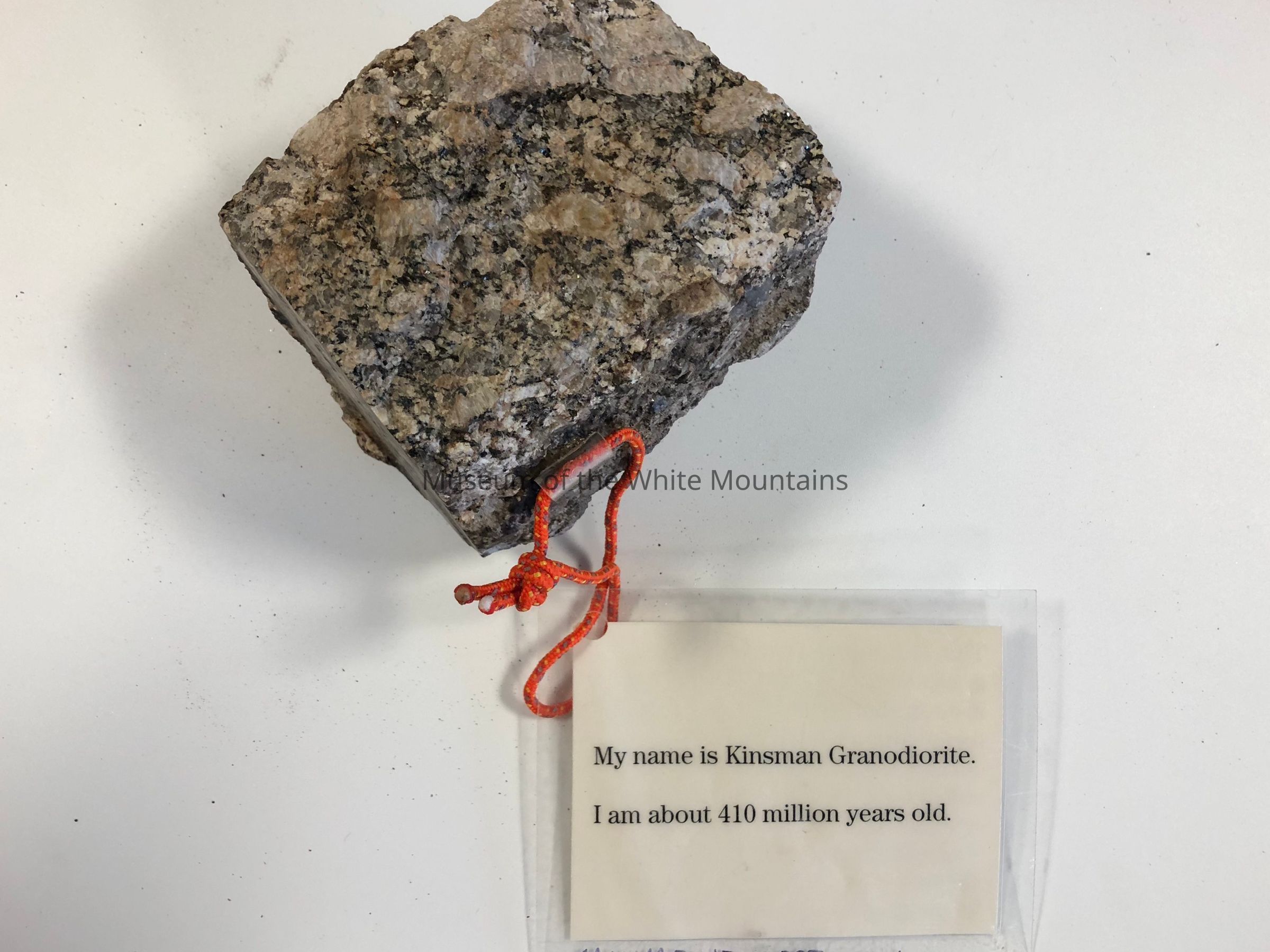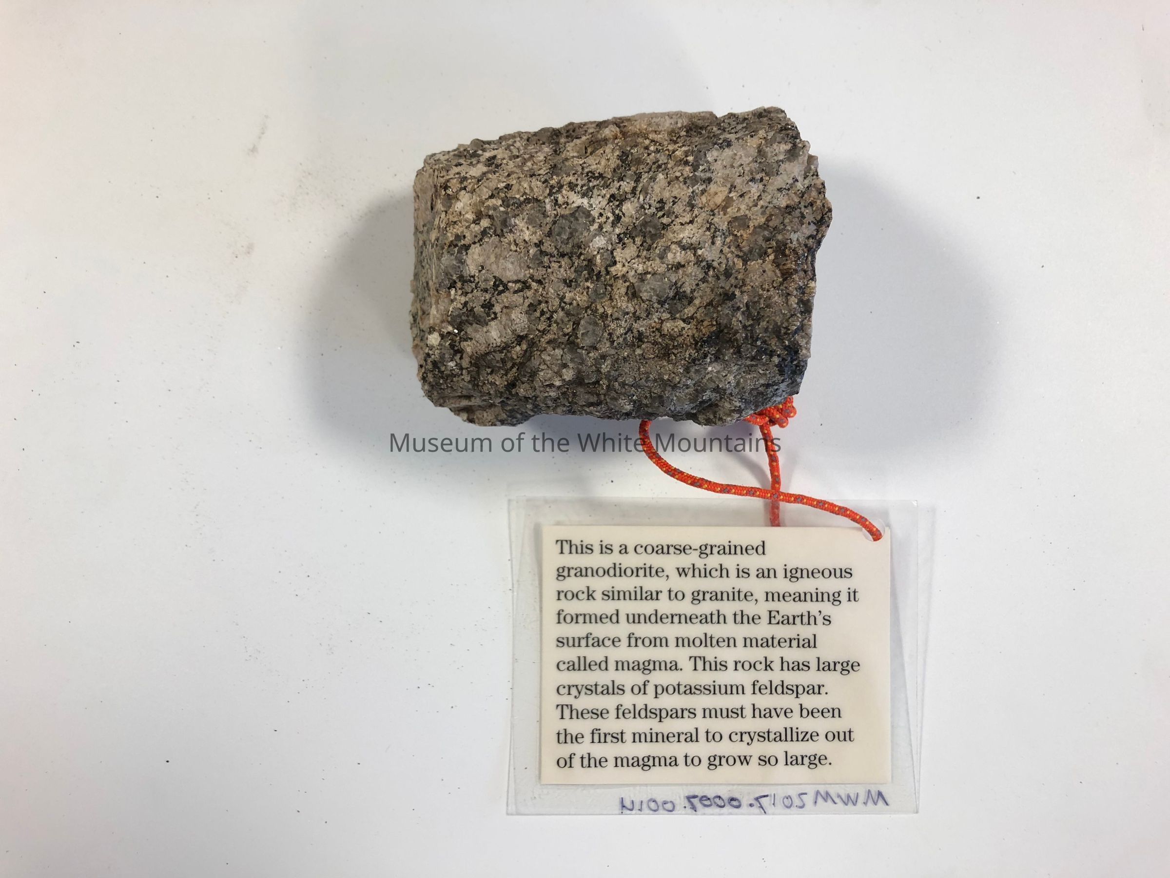 Small hand-sampled piece of Kingsman Granodiorite. This sample contains large crystals of potassium feldspar. This Kingsman Granodiorite is about 410 million years old. Collected by two well-trained geology students for the 2014 "Beyond Granite" exhibition at MWM. Part of a complete (or at least comprehensive) hand-sample collection of all the rocks of the White Mountains.Acquisition