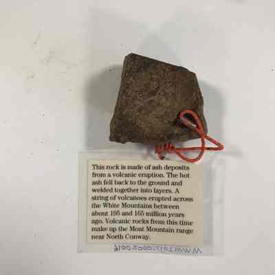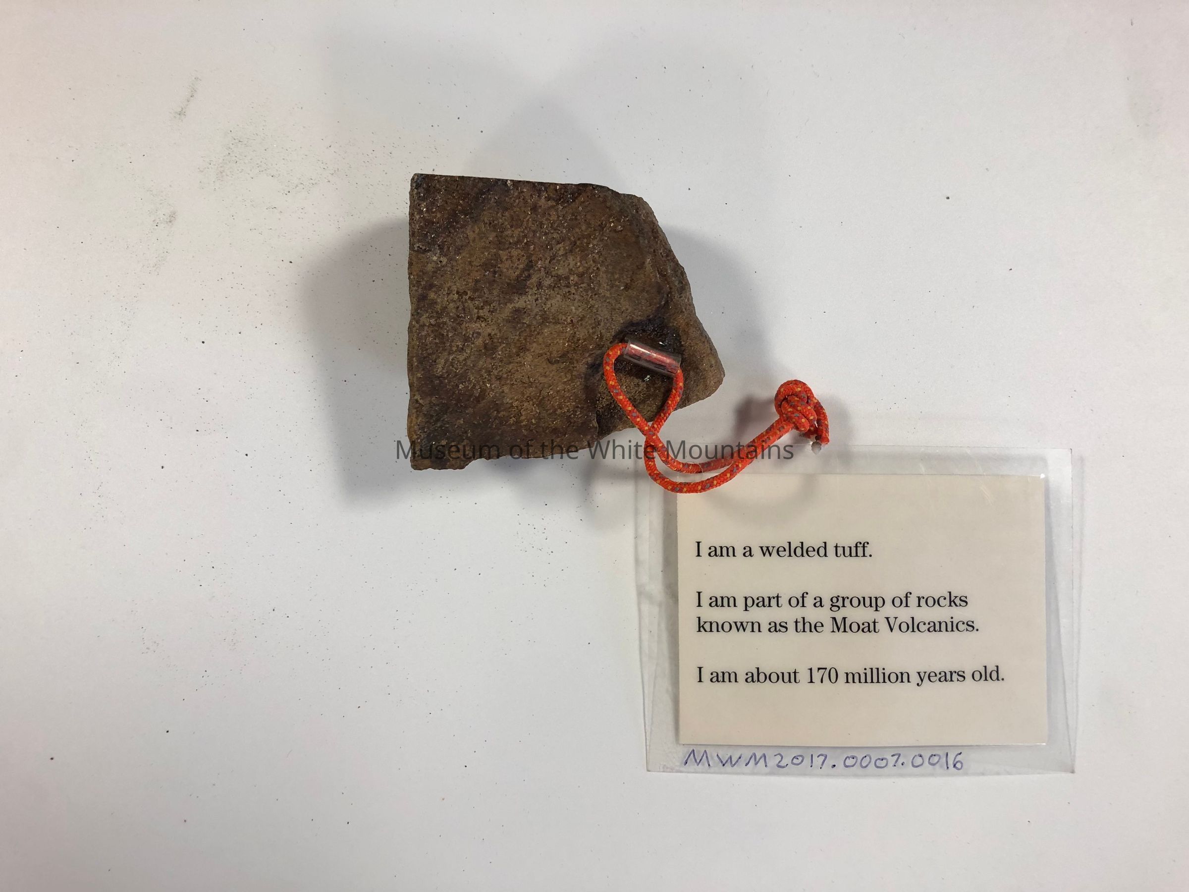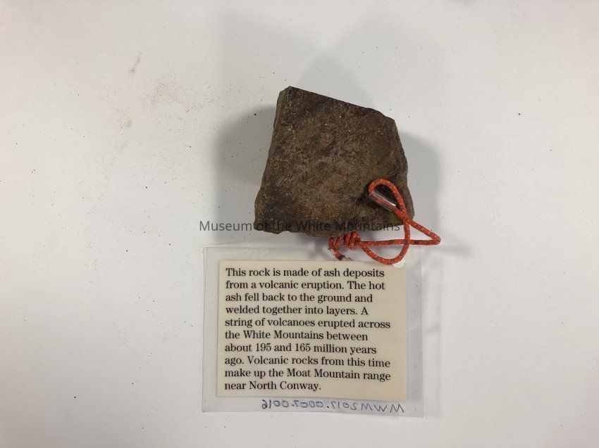 Small hand-sampled piece of welded tuff. This sample is about 170 million years old, made from ash deposits from a volcanic eruption. Volcanic rocks like this welded tuff make up the Moat Mountain range near North Conway. Collected by two well-trained geology students for the 2014 "Beyond Granite" exhibition at MWM. Part of a complete (or at least comprehensive) hand-sample collection of all the rocks of the White Mountains.Acquisition