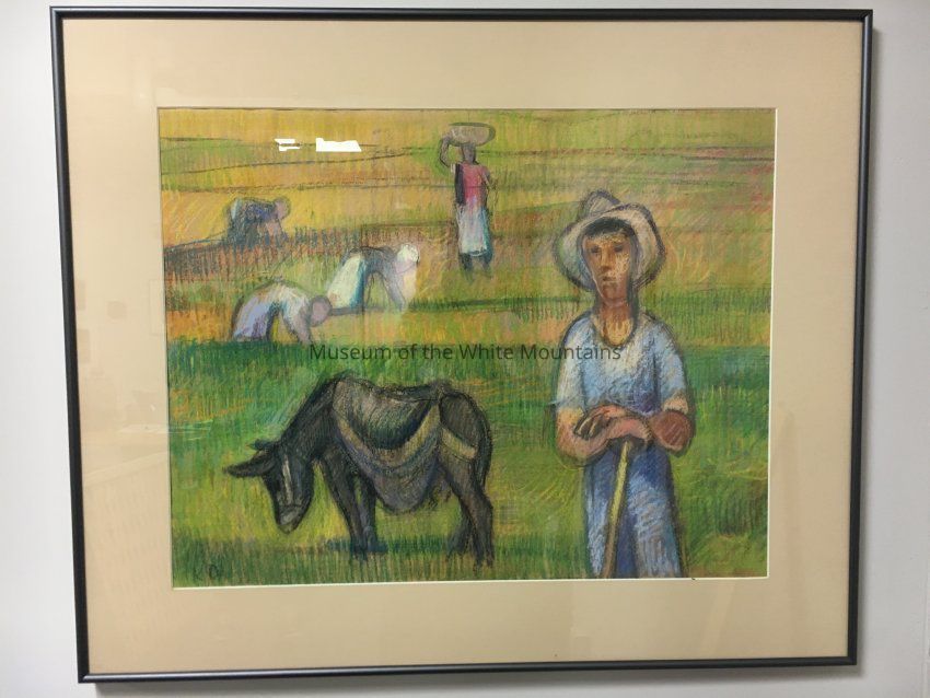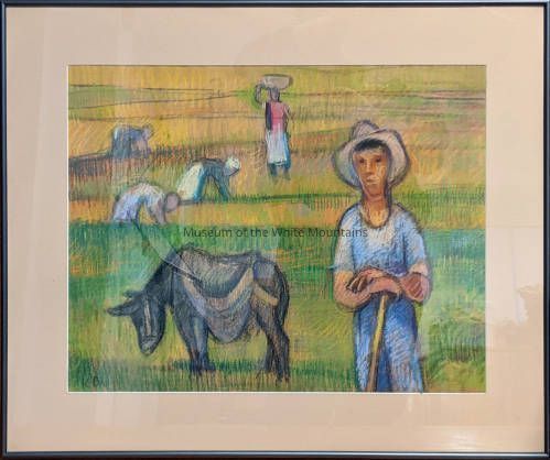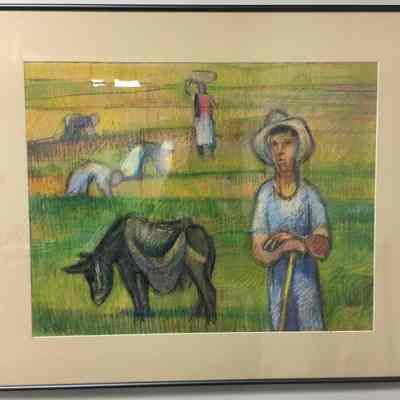 Framed pastel drawing of a farmer and his cattle. There is a person in the background carrying a basket on their head. Undated.Acquisition