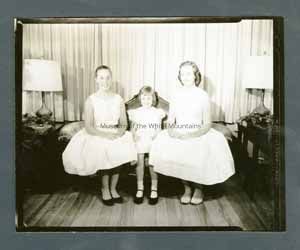 Black and white portrait photograph of three girls. All three girls are wearing white dresses and are sitting on a couch posing. Two coffee tables are on both sides with lamps, plants and bowls on top. A white curtain is the background.