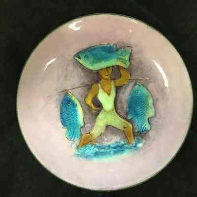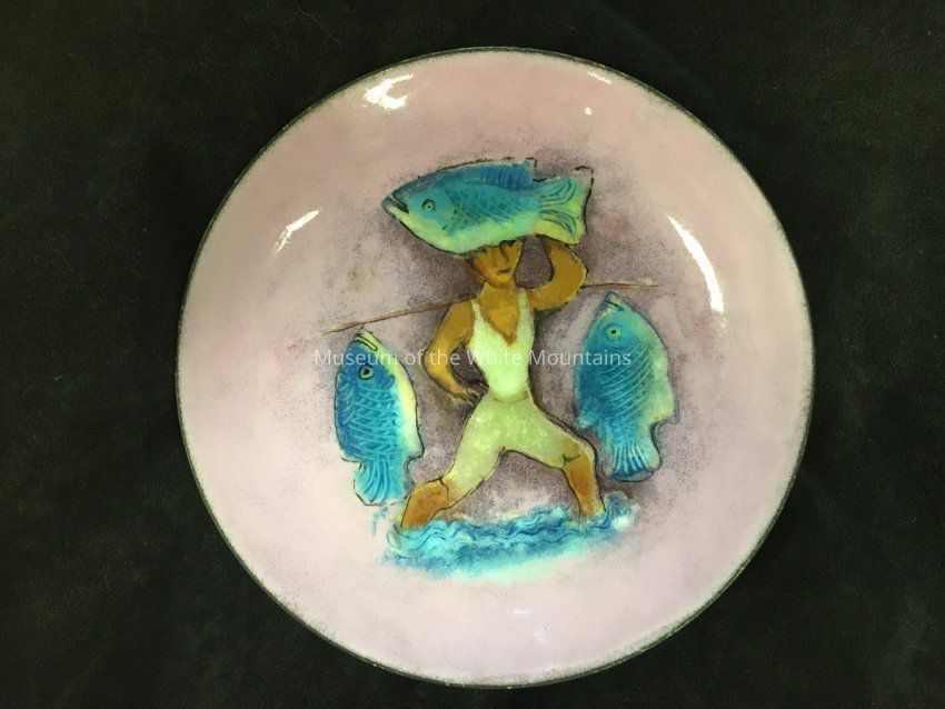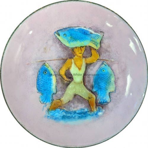 Enamel bowl depicting a man carrying two fish on a pole as well as a fish on his head. Undated.Acquisition